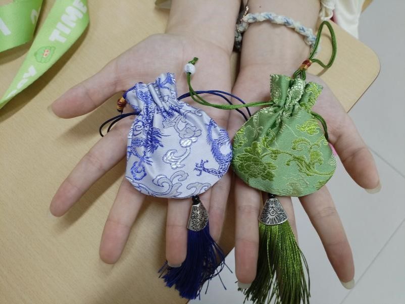 心理健康部志愿者精心筹备,提前准备好制作香囊所需的布料、香料、填充物,以及制作彩绳的彩线等材料,并配备了剪刀、尺子、胶水、笔等工具。活动现场,学生们热情高涨。在制作香囊环节,大家充分发挥动手能力,根据自己的自主想法裁剪布料、缝制香囊。有的学生在香囊上缝制出可爱的卡通图案,有的添加了精美的流苏、珠子等装饰,一个个个性十足的香囊在学生们手中诞生。同时,制作五彩绳的过程同样精彩纷呈。学生们凭借创意,将五彩线交织缠绕,编织出属于自己独一无二的五彩绳,每一根都承载着独特的设计与巧思。