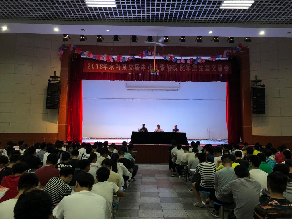 5月9日19:30,水利工程系在大礼堂举行了2018届毕业张旭军旅生涯交流会。系党支部书记李文林、院武装部长梁超水利工程系全体在校生参加交流会