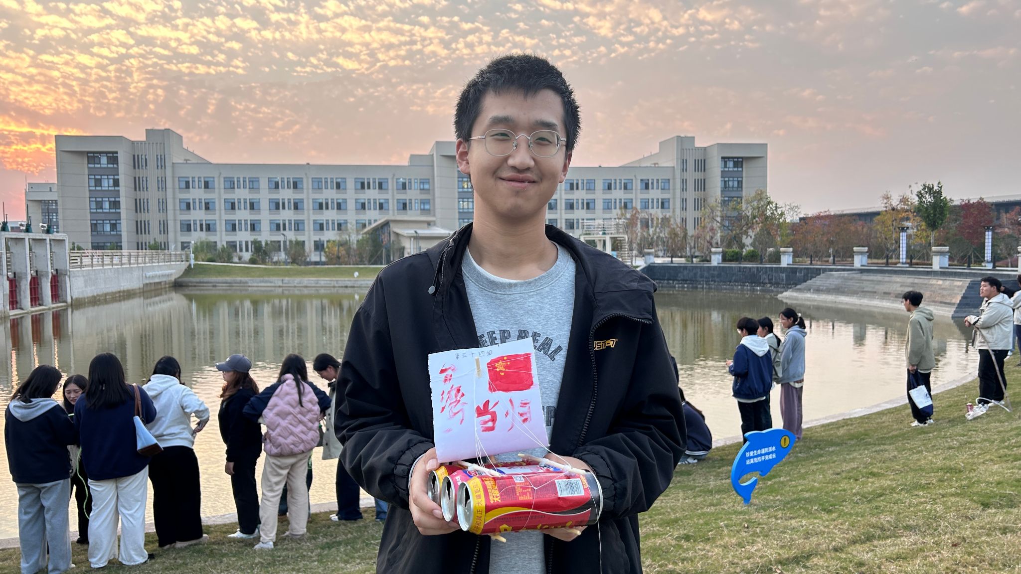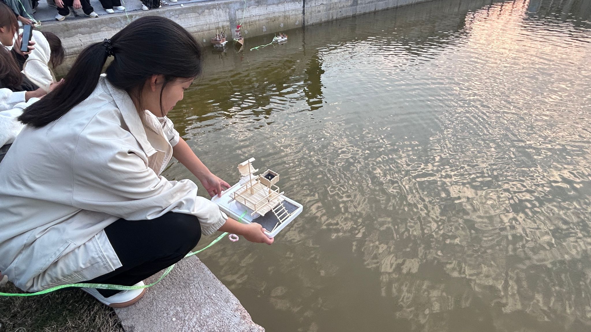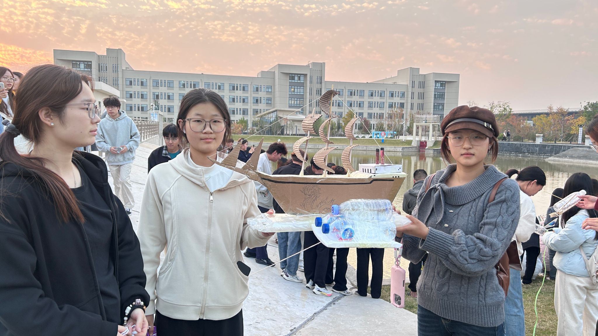 在制作环节中,同学们三人一组,充分利用塑料瓶、旧纸箱、泡沫板、易拉罐等常见废弃材料,结合流体力学、材料力学与结构稳定性等课堂知识,亲手设计并制作可在水面稳定漂浮的小船。在志愿者的引导下,各小组于指定安全水域进行了小船下水测试。同学们通过绳索操控小船行进,一艘艘形态各异、创意十足的环保小船水面上平稳前行,在水面平稳前行。现场气氛热烈,掌声与欢呼不断,青春的巧思与环保的热情交相辉映。经过综合评选,活动最终决出一等奖1名、二等奖2名、三等奖3名。