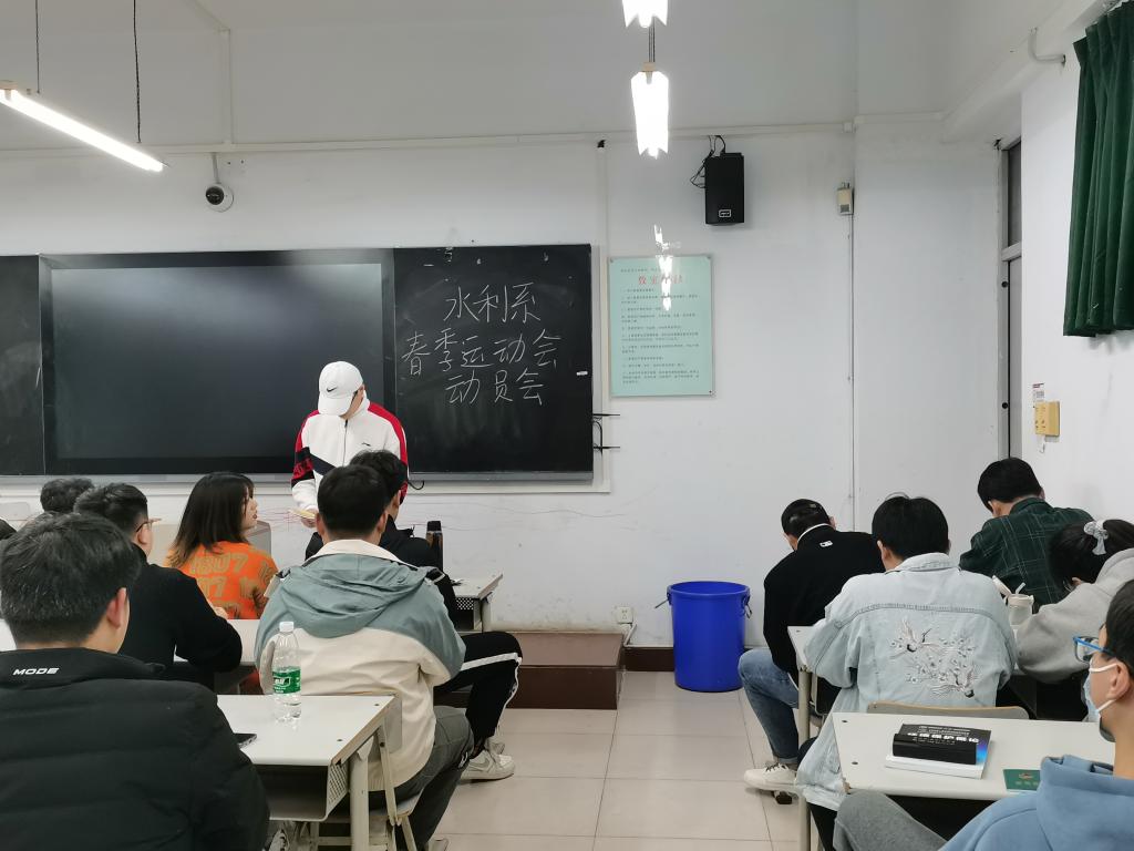 我们号召同学们以饱满的热情迎接运动会,积极参与,全力备战,要充分展现“更快、更强、更高”的自我挑战精神为水利工程系争光添彩。