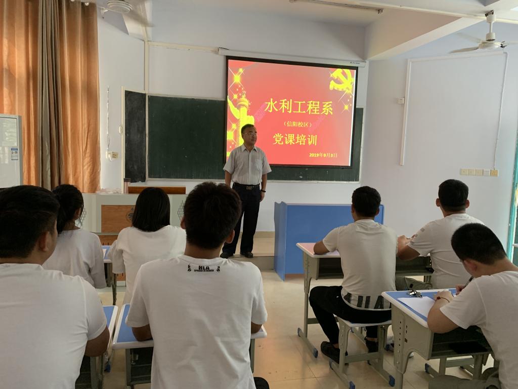 2019年9月3日下午,水利工程系在信阳校区开展了本学期第一次党课培训,主题是共产党员的先锋模范作用,党总支书记李文林老师主讲。以革命前辈的先进事例教育入党积极分子如何发扬不怕苦不怕累的精神,时刻不忘初心,牢记使命,踏踏实实学习,团结同学,互帮互助。