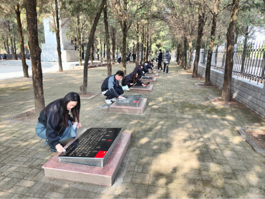 清晨,同学们在学校集合,有序排队登上大巴车,怀着崇敬的心情前往烈士陵园。抵达目的地后,大家肃然而立,展现出良好的集体纪律性。活动伊始,同学们手持鲜花,向革命烈士纪念碑深深鞠躬,默哀致敬。随后,他们缓步前行,将鲜花敬献于纪念碑前,以此表达对先烈们的崇高敬意。在献花仪式结束后,学生们拿出湿巾,认真地擦拭每一块烈士墓碑,缅怀先烈,寄托哀思。