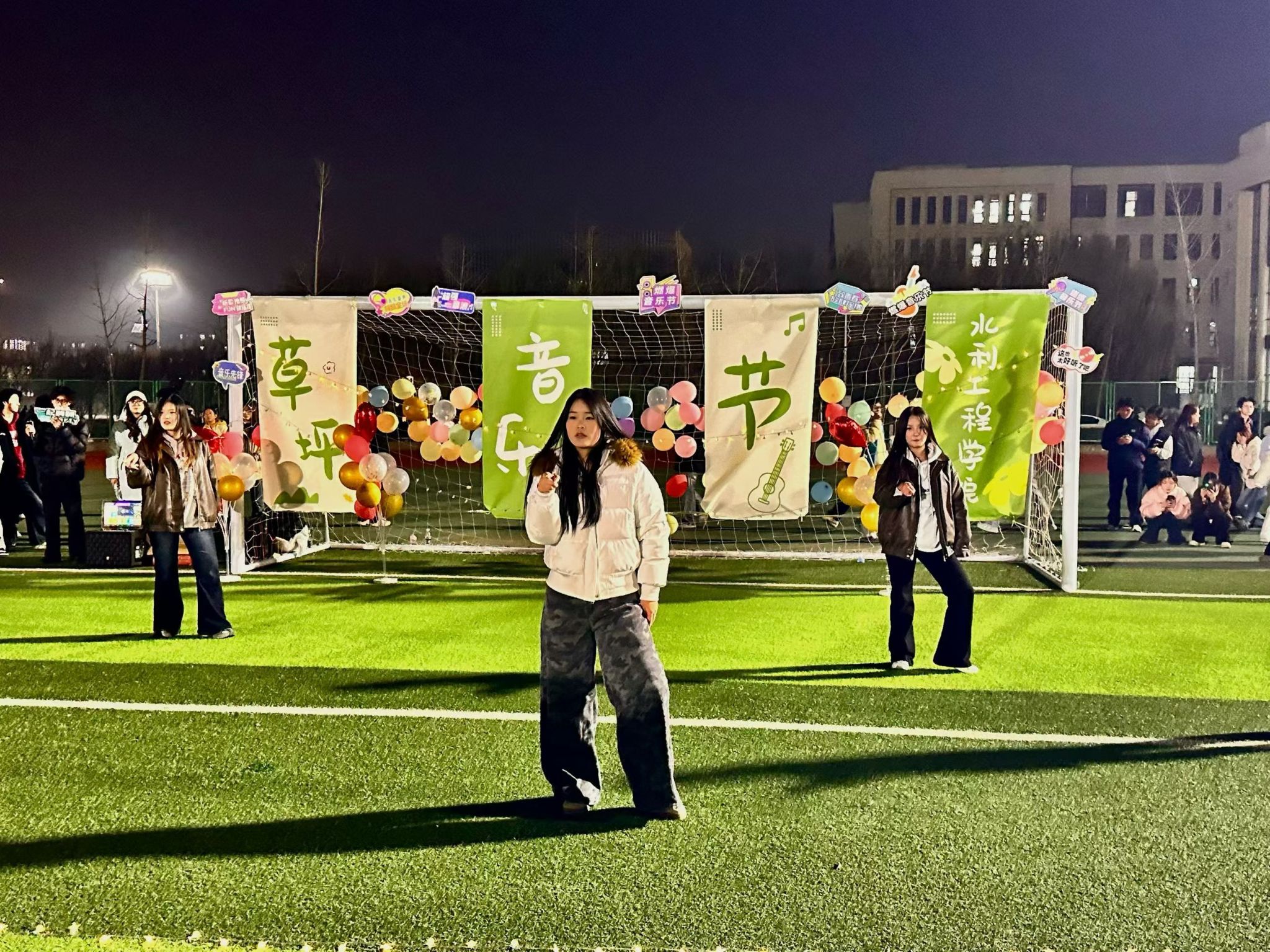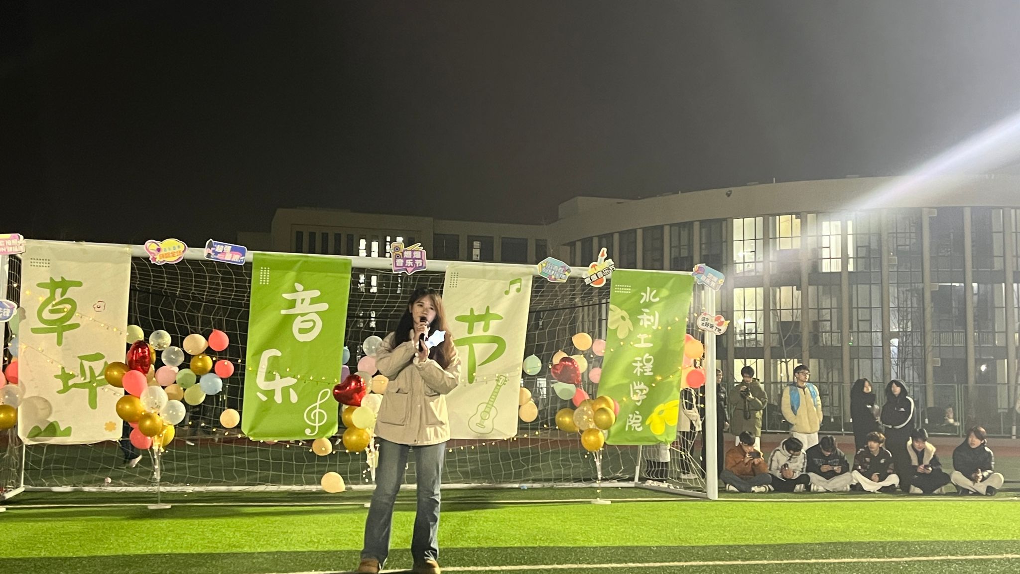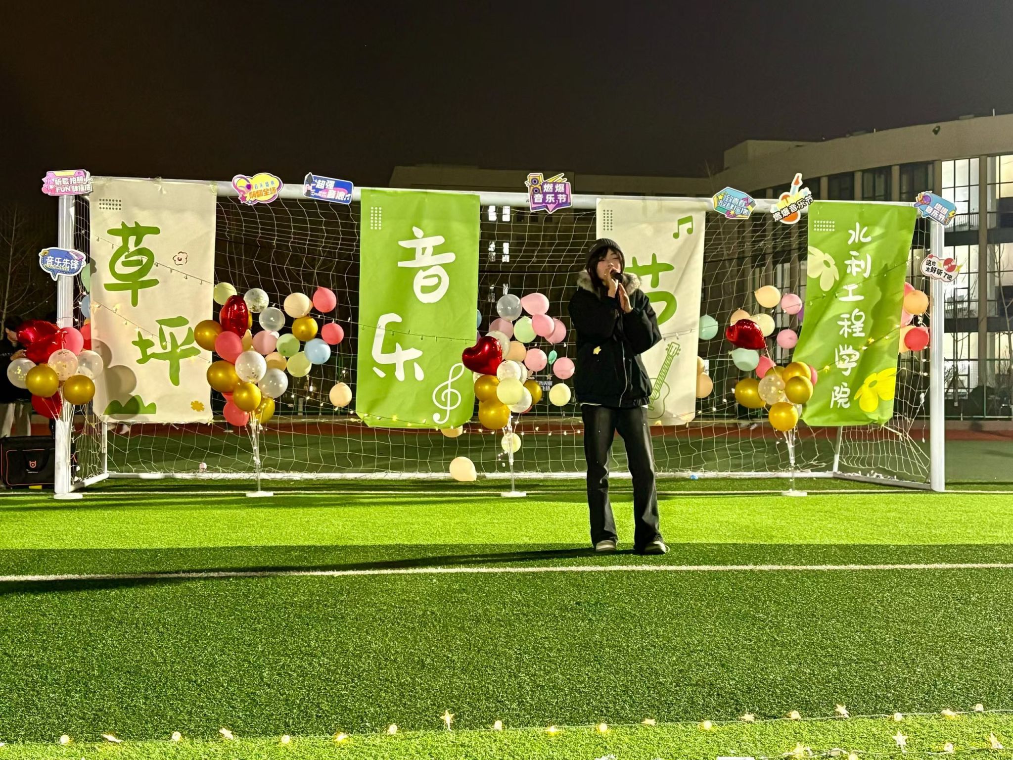 暮色中的绿茵场荧光闪烁,师生齐聚,氛围温馨热烈。音乐节在众人的期待中拉开序幕,歌声与欢笑贯穿始终。歌曲演绎环节精彩纷呈:24智水2班袁振以《用背脊唱情歌》深情开场,25水工3班魏奥翔、李羽翔合唱的《手写的从前》旋律悠扬,24安管1班高灿宇带来的《天后》引发全场共鸣;随后,25水工5班石欣冉演唱的《有点甜》轻快甜美,24水电1班王宇瑞的《同手同脚》温暖真挚,24水建国际2班高子讯演绎的《最佳损友》情感深刻,24安管2班左勐娣的《想你时风起》温柔治愈,最后由24水工1班叶锦源以一首《我怀念的》细腻收尾,将现场氛围推向高潮。